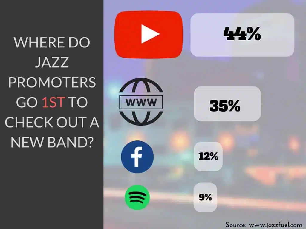 For me as a booking agent – and you as an independent jazz musician – it helps to know how promoters are discovering new music. Because if you know that, you can try and improve the way you are represented in those areas.