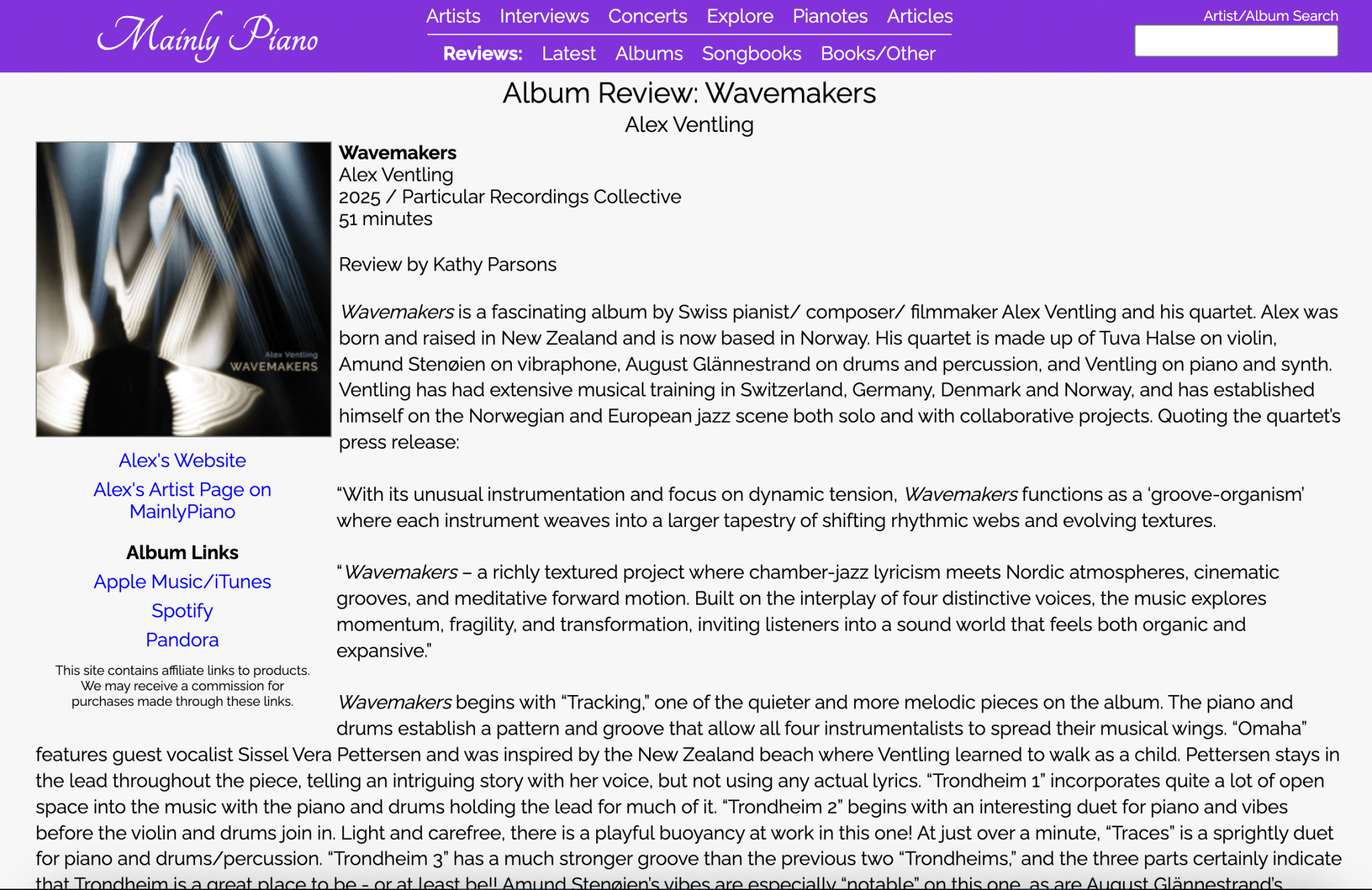 Trondheim based, Swiss-New Zealand pianist, composer, and filmmaker Alex Ventling unveils his new quartet album Wavemakers – a richly textured project where chamber-jazz lyricism meets Nordic atmospheres, cinematic grooves, and meditative forward motion. Built on the interplay of four distinctive voices, the music explores momentum, fragility, and transformation, inviting listeners into a sound world that feels both organic and expansive.