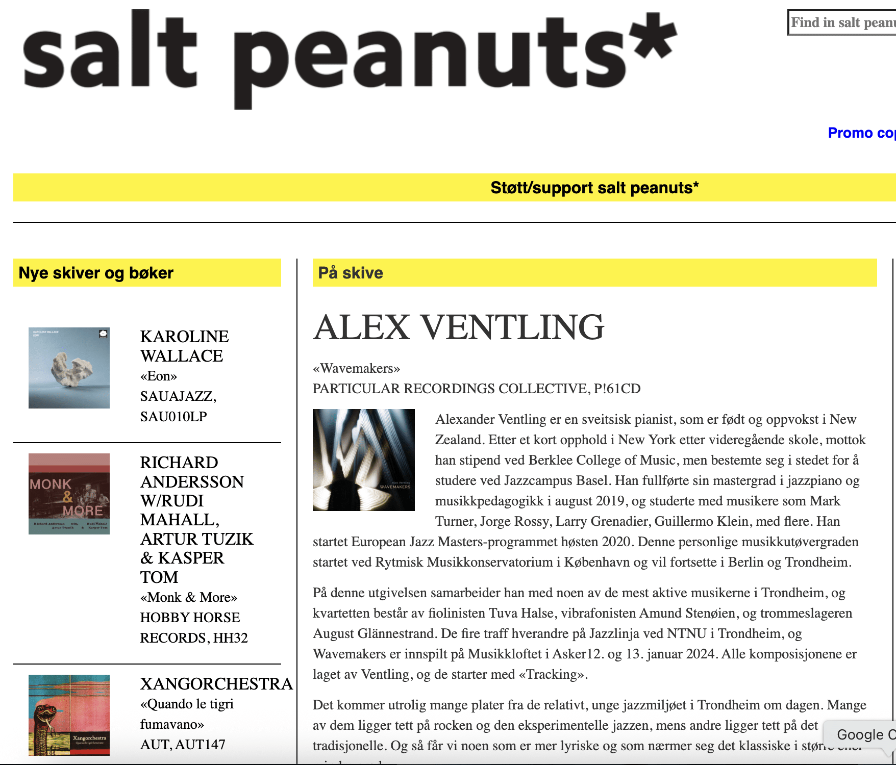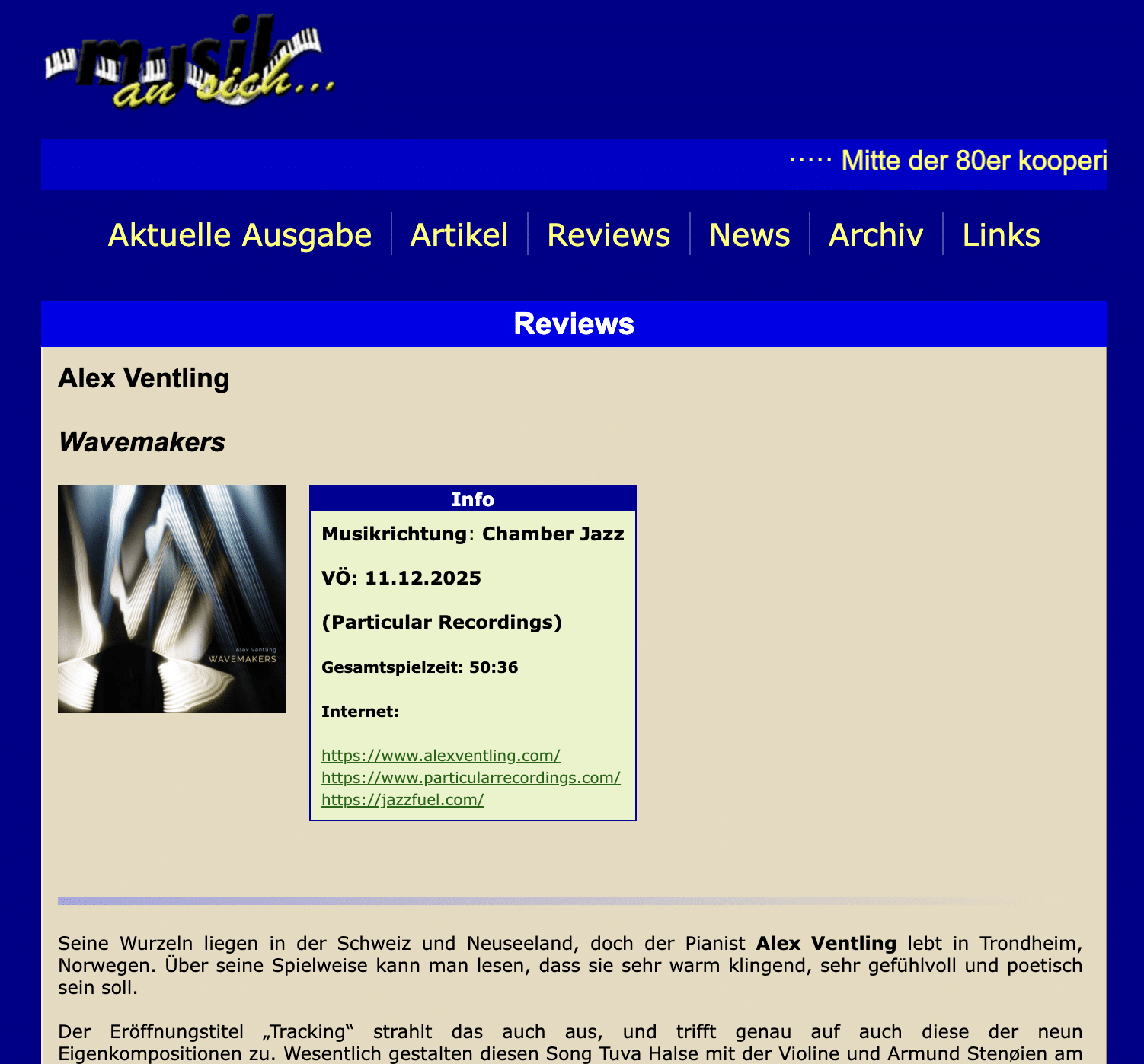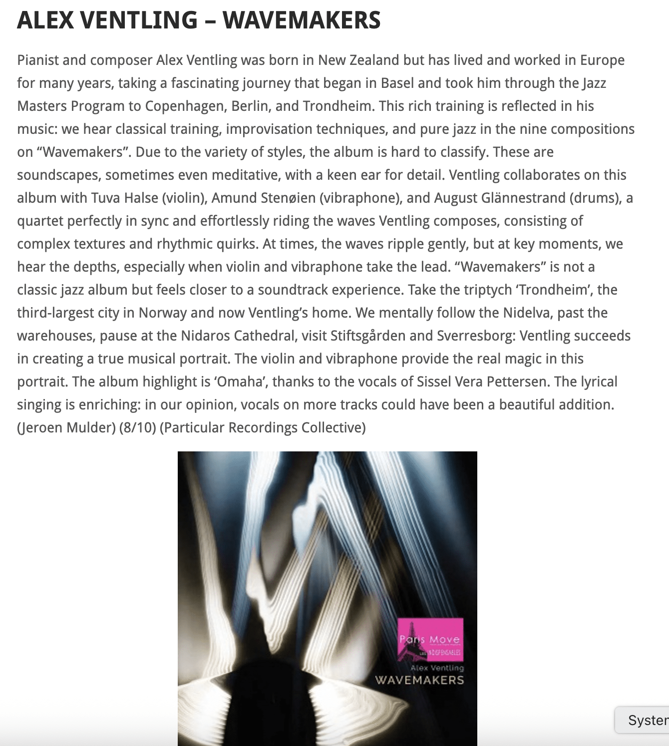 “I think Alex Ventling and his excellent fellow musicians have made a relatively melancholic and nice album, which is appropriate at a time when winter is about to descend upon us, both in the rainy city of Trondheim and along the coast southwards where one sits in the study and finds a pleasant calm and well-being after listening to this release.”