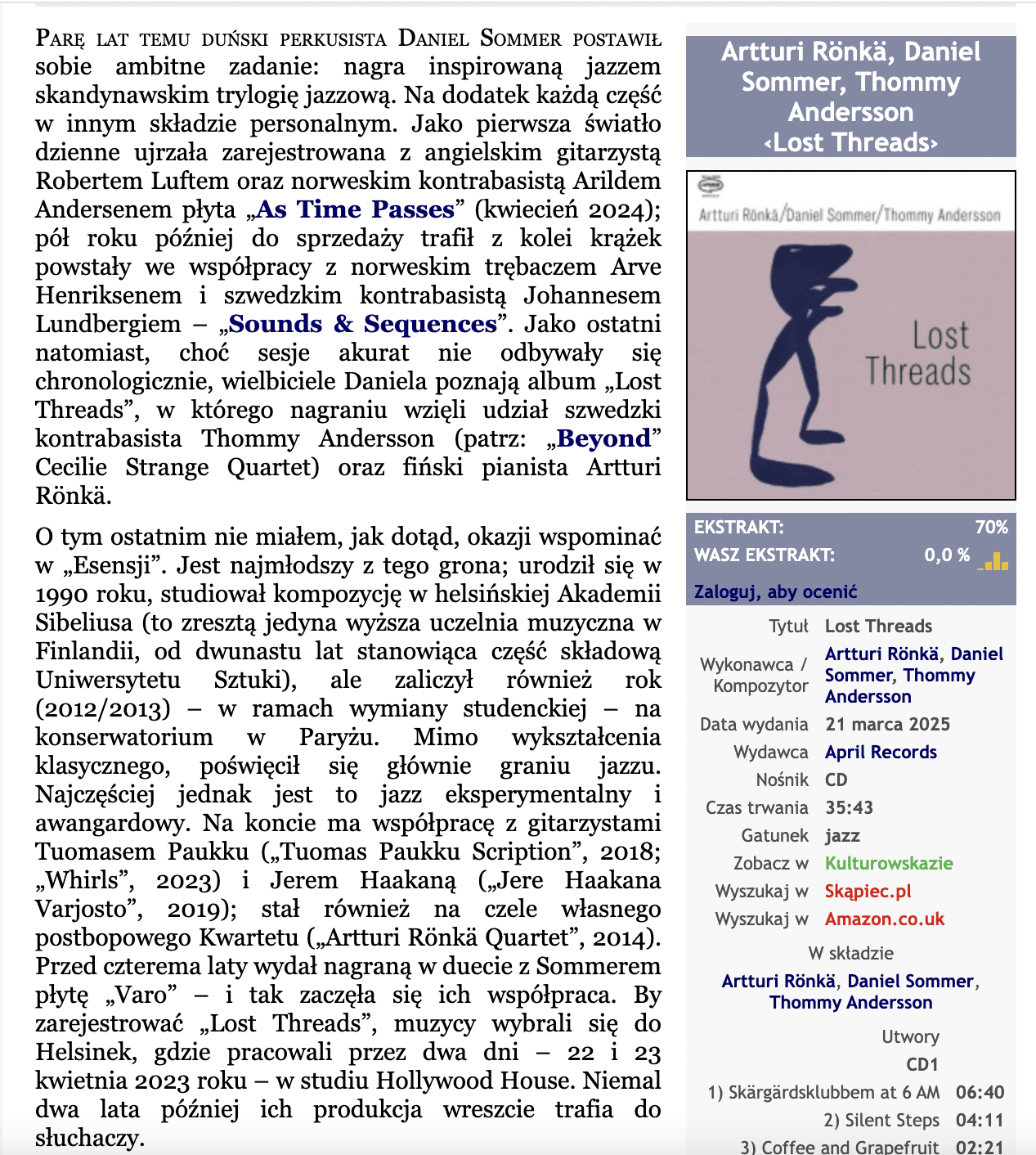Lost Threads ” is intimate and quiet music, the successful recording of which brings the beautiful sound of acoustic instruments alive and close to the listener”