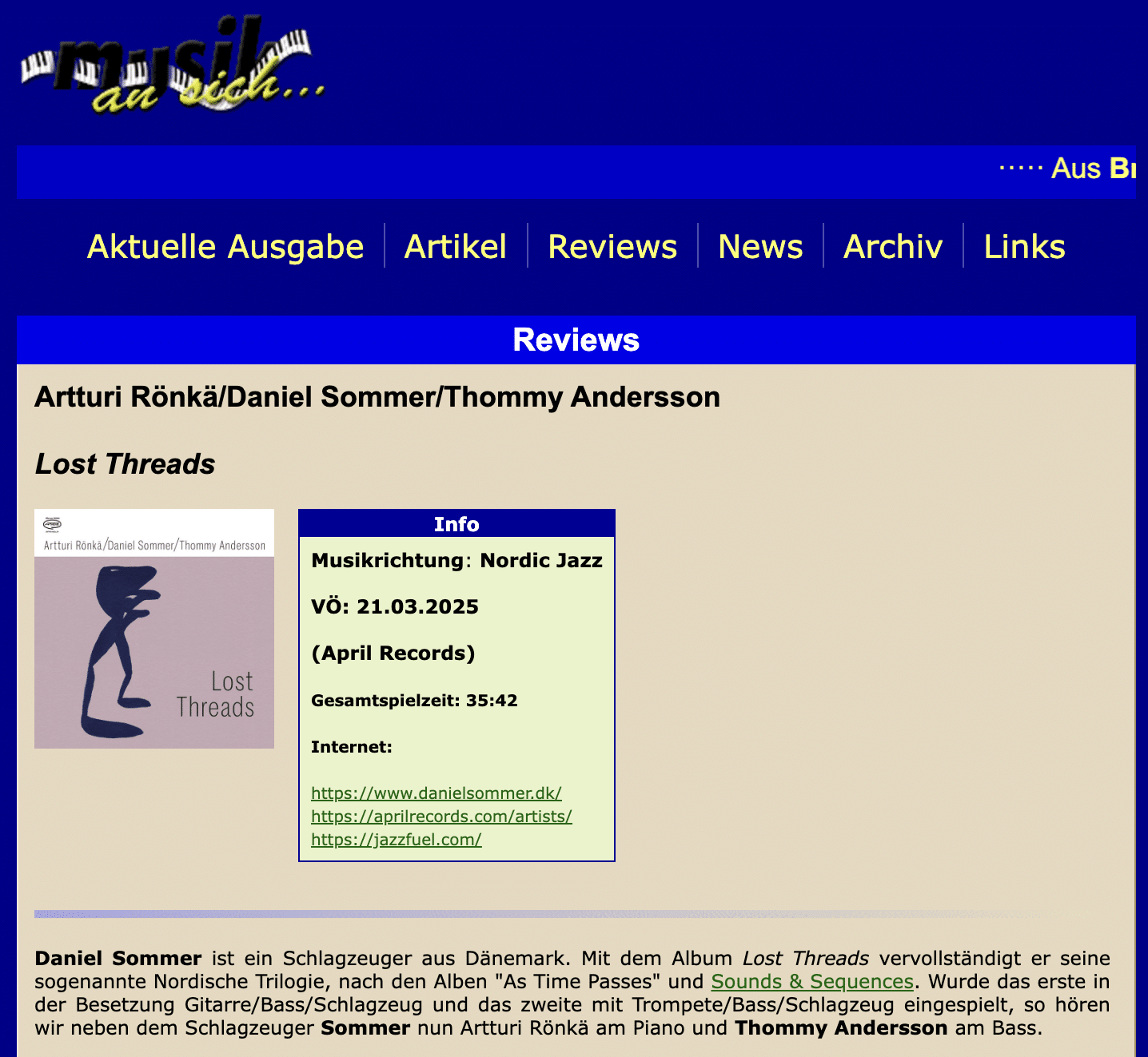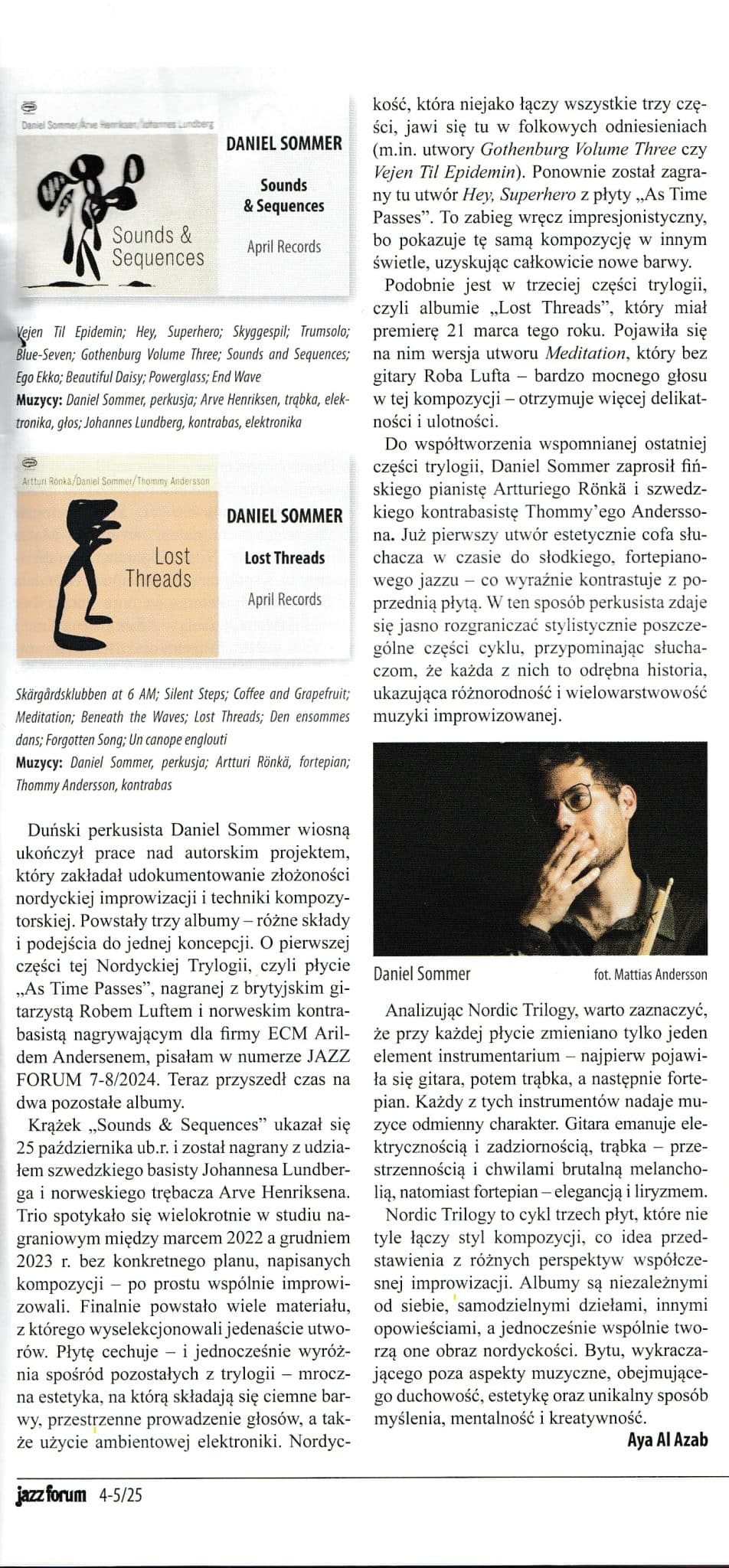 Danish drummer Daniel Sommer completes his internationally acclaimed Nordic Trilogy (featured in Stereogum, Downbeat Magazine, Bandcamp’s Best of Jazz and more…) with the release of Lost Threads on March 21st, 2025, via April Records.