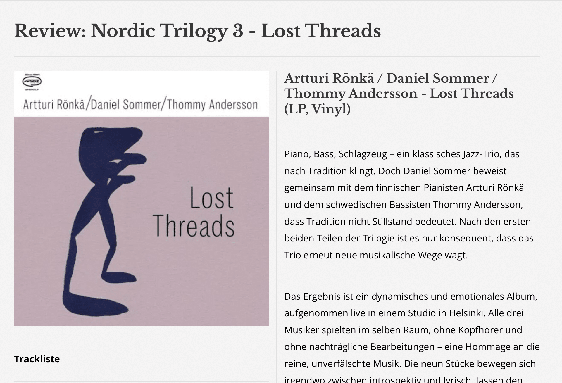 With influences ranging from Nordic folk, Western Classical music and the jazz tradition, Lost Threads continues the trilogy’s history of blurring the boundaries between composition and improvisation. The trio’s collective sound—anchored by Rönkä’s nuanced piano, Andersson’s deeply personal bass tones, and Sommer’s textural drumming—creates a sonic landscape both timeless and contemporary.