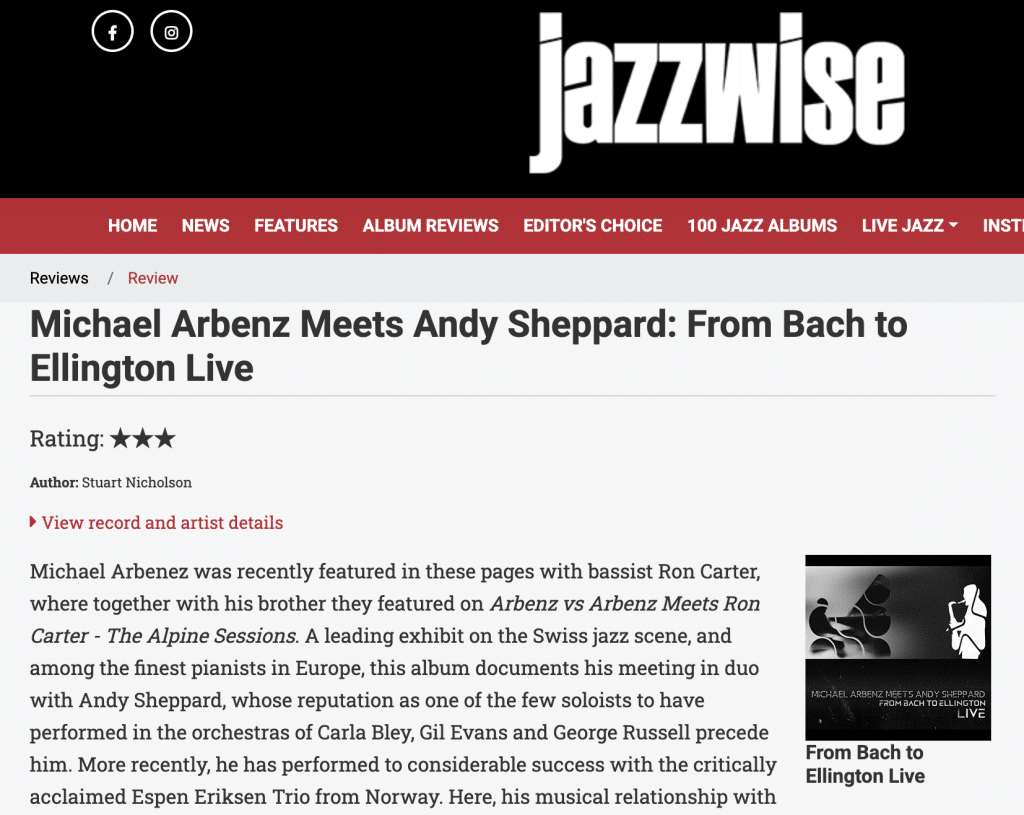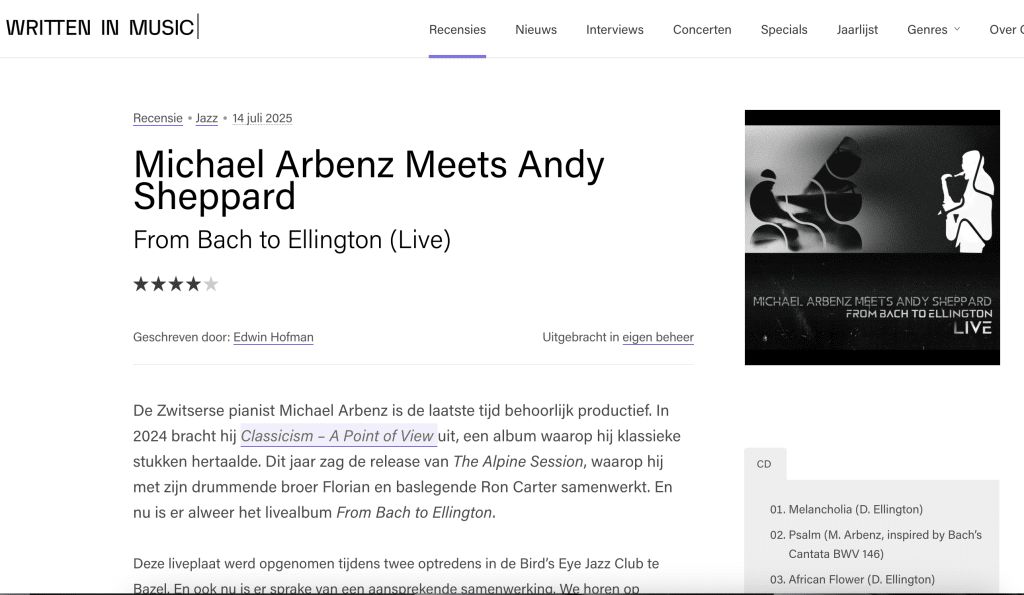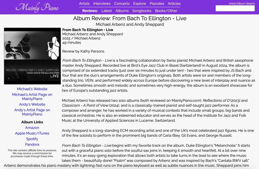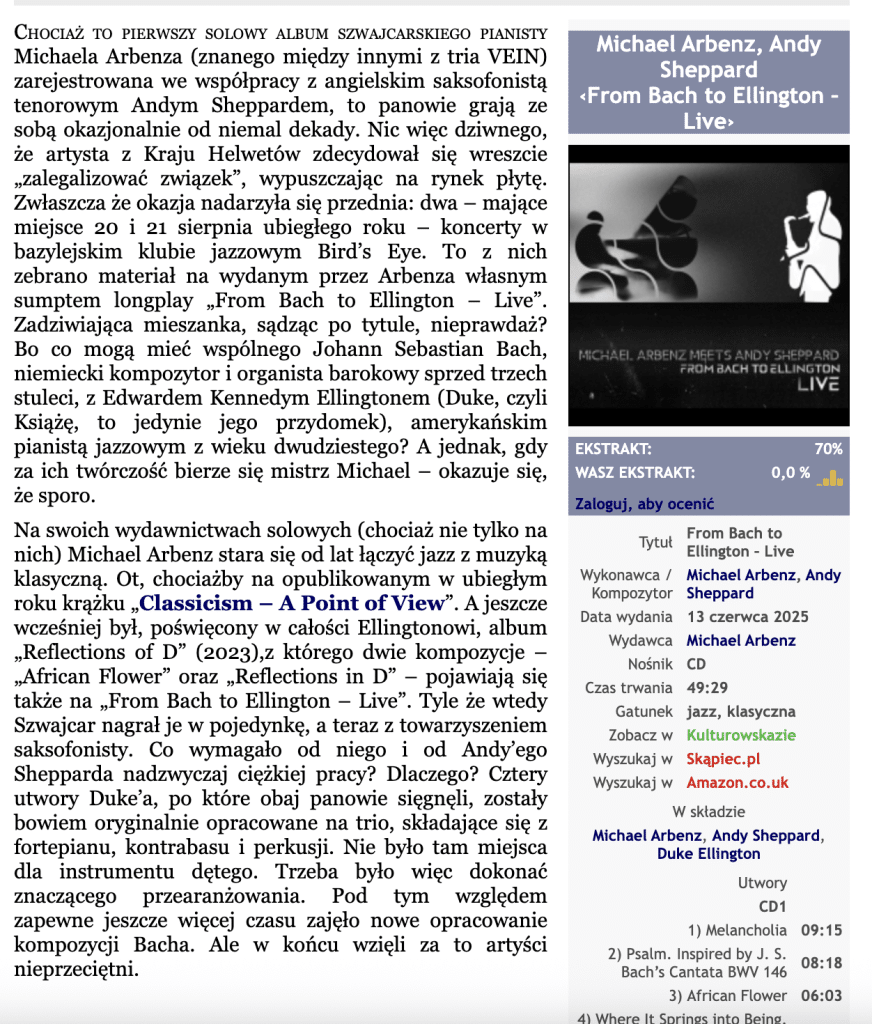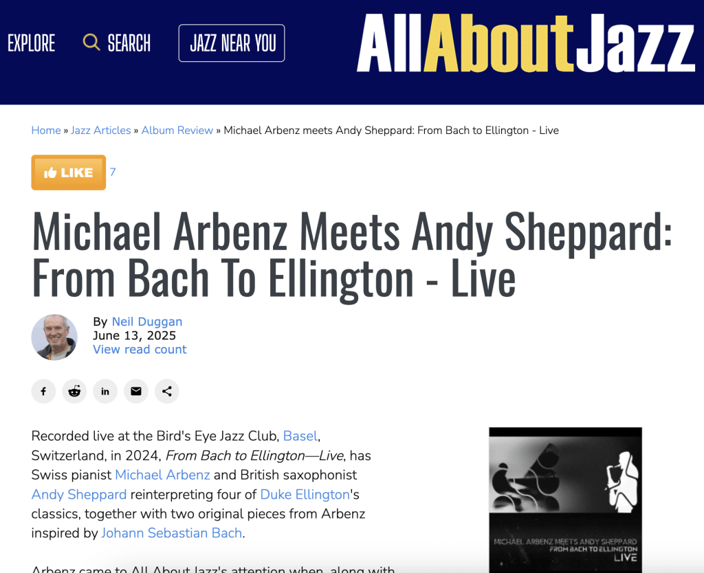 Swiss pianist Michael Arbenz and British saxophonist Andy Sheppard come together for ‘From Bach to Ellington’—a melodic, energetic, interactive live recording set for June 13th, 2025.