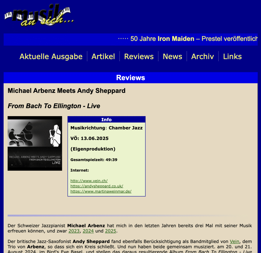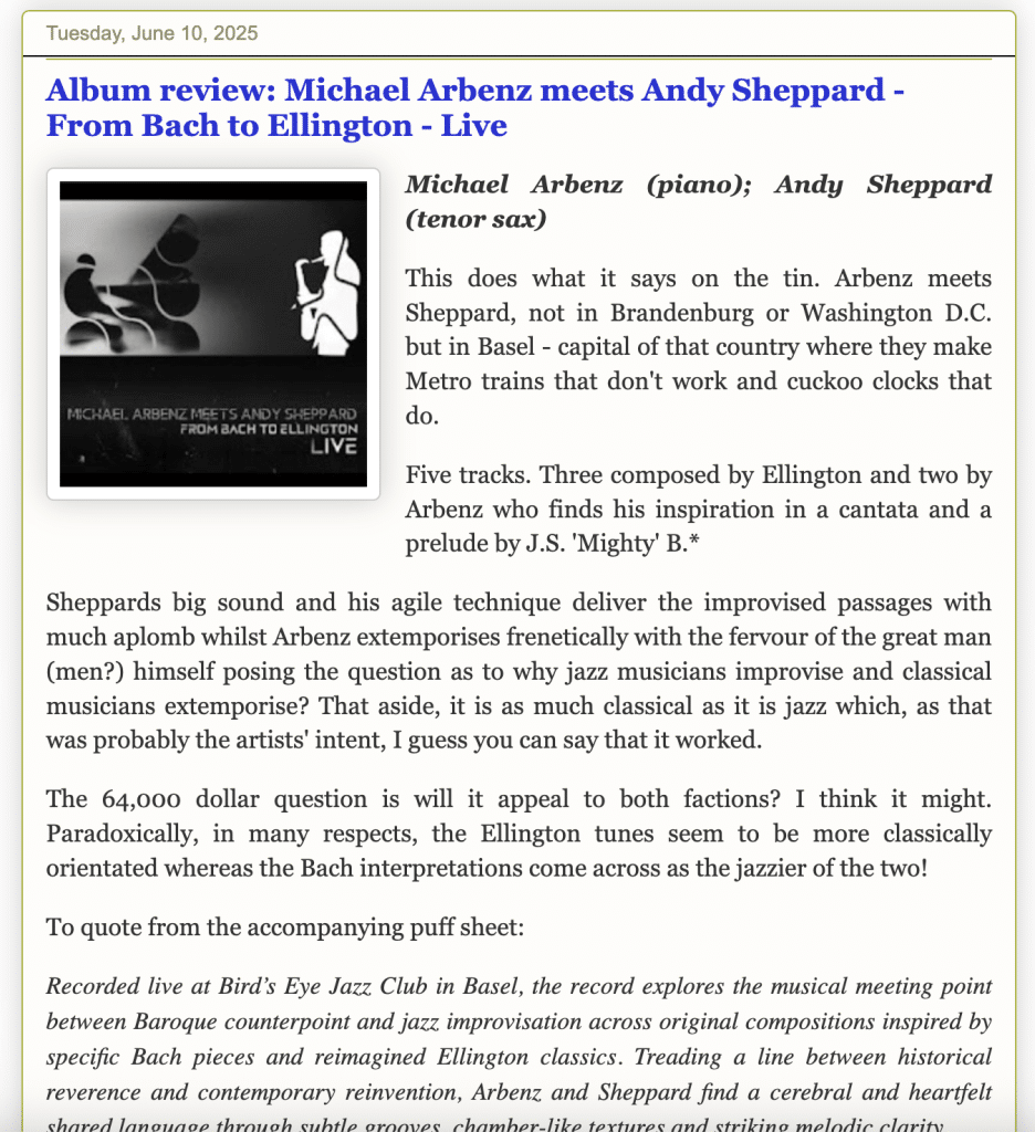 Michael Arbenz meets Andy Sheppard | From Bach to Ellington – Live | June 13, 2025